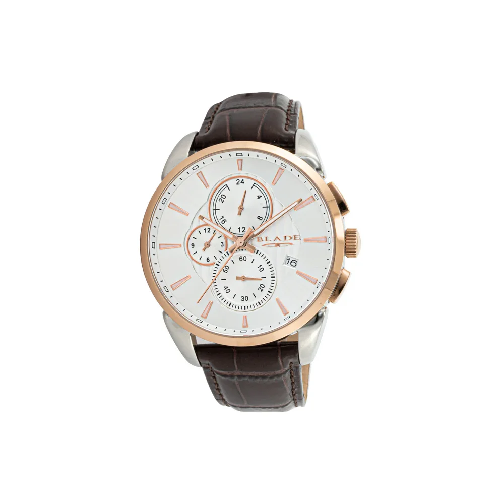 BLADE Victory Shell 3599G1USO – Falco Collection – Round – 45mm Stainless Steel Case – TT PVD Rose Gold Plating – Hardened Mineral Glass – Silver Dial – Dual-Time Multifunction Quartz Movement – 22mm Brown Genuine Leather Strap – Tang Buckle – 5ATM Water Resistant – Men’s Watch – 2 Years Warranty