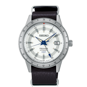 A premium Seiko Presage SSK015J1 featuring a white/silver dial with vintage “Style 60s” design and brown leather strap. This limited edition GMT watch combines classic elegance with dual-time functionality, making it perfect for formal and refined everyday wear.
