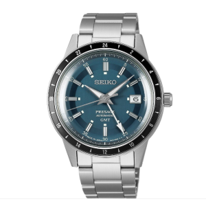 A refined and elegant automatic GMT watch featuring a petrol blue dial with vintage “Style 60s” design. The SSK009J1 combines classic Presage aesthetics with modern dual-time functionality, making it perfect for both formal and everyday wear.
