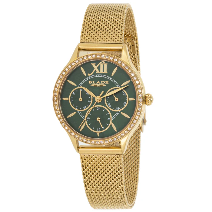 BLADE Glam Power 3657L2GEG – Mystique Collection – Round – 34mm PVD Gold Stainless Steel Case – Hardened Mineral Glass – Green Dial – Japan Multifunction Quartz Movement – 16mm PVD Gold Stainless Steel Mesh Strap – Double Lock with Safety Clasp Buckle – 3ATM Water Resistant – Women’s Watch – 2 Years Warranty.