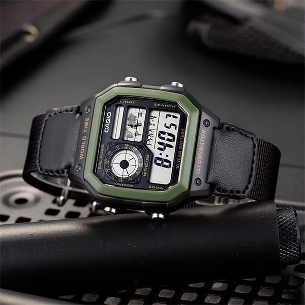 The Casio AE1200WHB-1B is a rugged digital world-time watch designed for everyday wear and travel. Featuring a bold black design, easy-to-read LCD with world map display, and durable resin construction, it offers 31 time zones, 5 alarms, stopwatch, countdown timer, and an LED backlight. Powered by a long-lasting 10-year battery and protected with 100 m water resistance, it delivers reliable performance with a sporty, functional style.