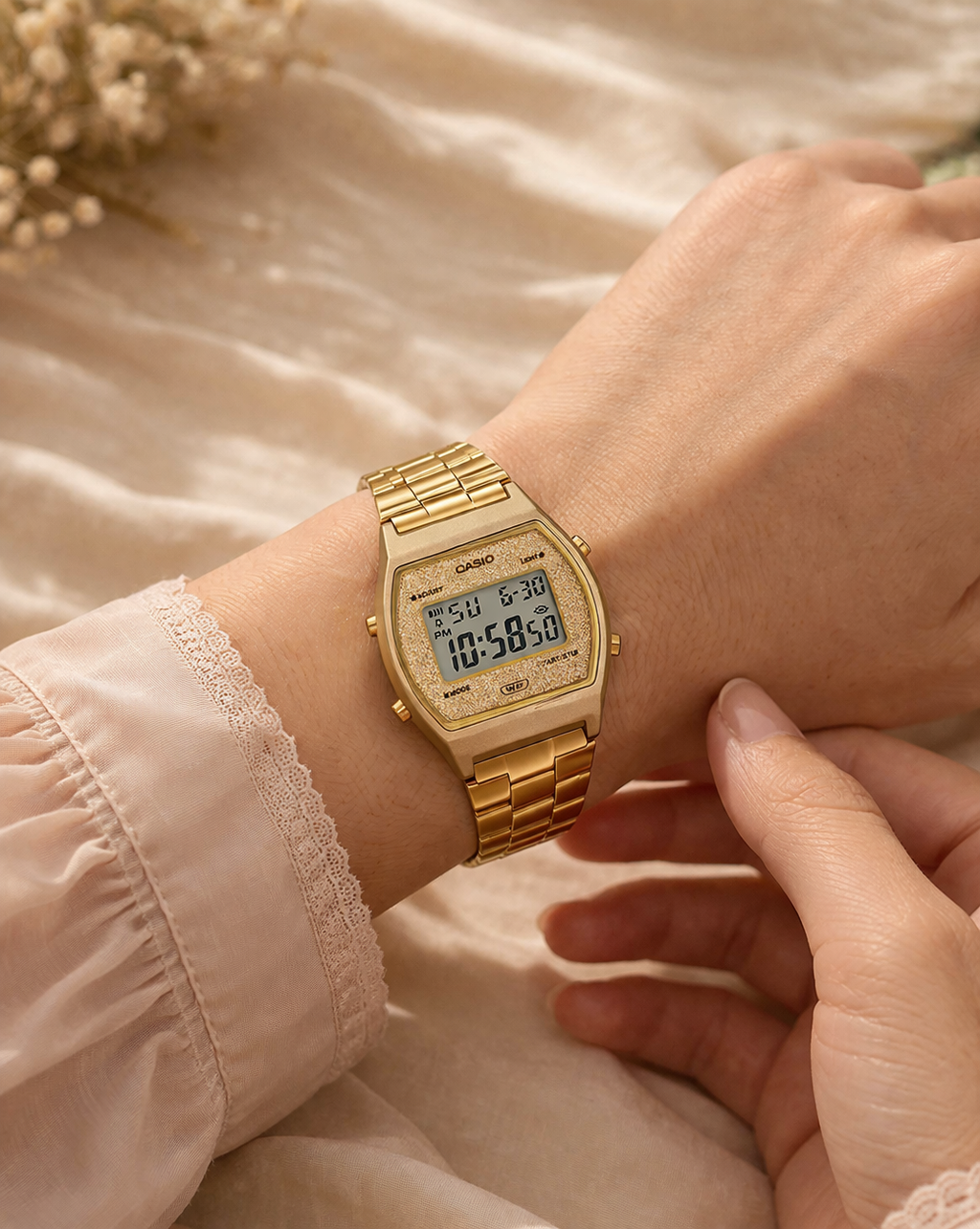Step into retro style with the Casio B640WGG-9D Gold, a perfect mix of vintage design and modern functionality. Featuring a gold-tone stainless steel band and unique glitter dial, this watch adds a premium touch to your everyday look.