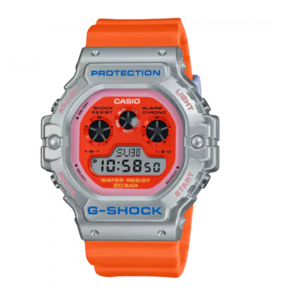 The CASIO G‑SHOCK DW5900EU‑8A4 is a vibrant and rugged digital watch from Casio’s iconic 5900 Series, designed to stand out with its energetic color accents and bold style. Featuring a silver‑tone metallic‑coated bezel and a mirror‑finish LCD paired with bright orange details on the band and dial, this model delivers both character and practicality. Built with classic G‑SHOCK toughness, it offers shock resistance, 200 m water resistance, and a long battery life — making it reliable for everyday wear, active lifestyles, and outdoor adventures. Loaded with essential digital functions like world time, stopwatch, countdown timer, multiple alarms and a full auto‑calendar, this watch blends bold fashion with everyday functionality.
