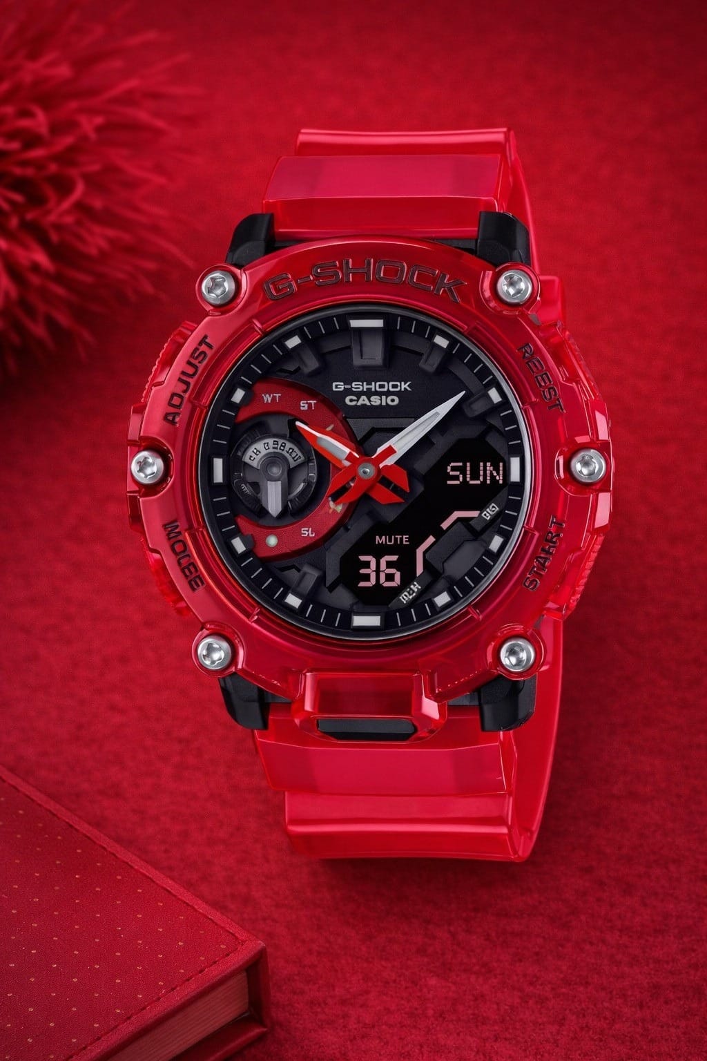 The Casio G-Shock GA2200SKL-4A brings bold colour and robust performance together in a striking translucent red design inspired by dynamic sound waves. This sporty analog-digital watch features a Carbon Core Guard structure that enhances shock resistance while keeping the case slim and durable — perfect for everyday wear and outdoor adventures. Its vibrant transparent red resin bezel and strap pair with a deep contrasting dial for a standout look. The watch is packed with practical functions like world time, stopwatch, countdown timer, multiple alarms, and full auto-calendar, all backed by 200 m water resistance and bright Super Illuminator LED lighting for excellent visibility in low light.