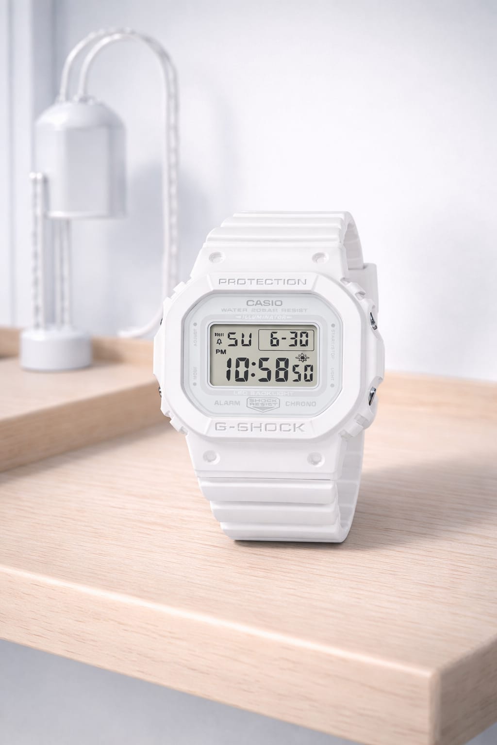 A clean and minimal digital watch featuring a full white matte finish with a soft light-grey display. The GMD-S5600BA-7D offers a compact square design with G-SHOCK durability—perfect for everyday sporty and casual wear.