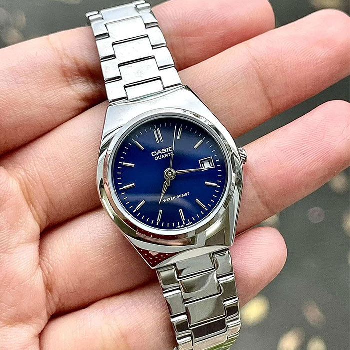 The Casio LTP-1170A-2A is an elegant ladies’ analog watch featuring a stainless-steel case and bracelet with a stylish blue dial. Powered by reliable quartz movement, it offers precise timekeeping, a date display, and durable mineral glass. Its classic design and slim profile make it suitable for both everyday wear and formal occasions.