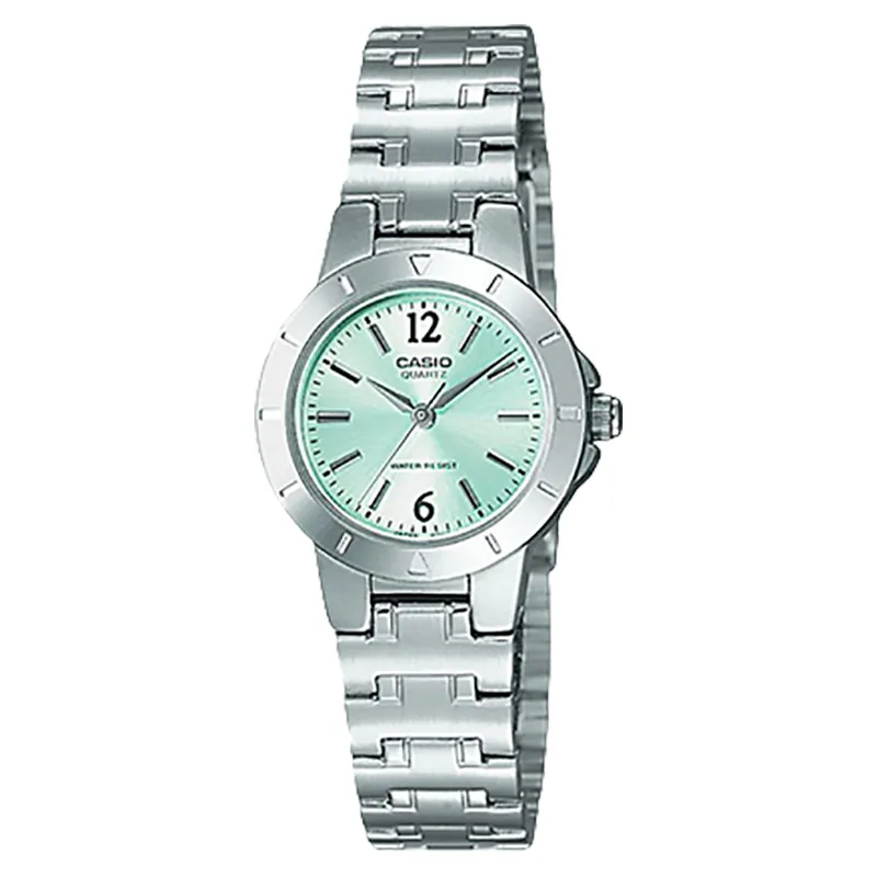 The Casio LTP‑1177A‑3A is a stylish ladies’ analog watch featuring a refreshing green dial and a durable stainless-steel bracelet. Designed with a slim and elegant profile, it offers reliable quartz movement, clear analog timekeeping, and scratch-resistant mineral glass. Its classic design makes it suitable for everyday wear as well as formal occasions.