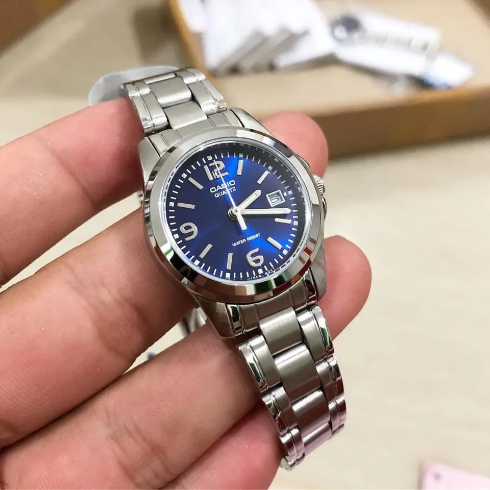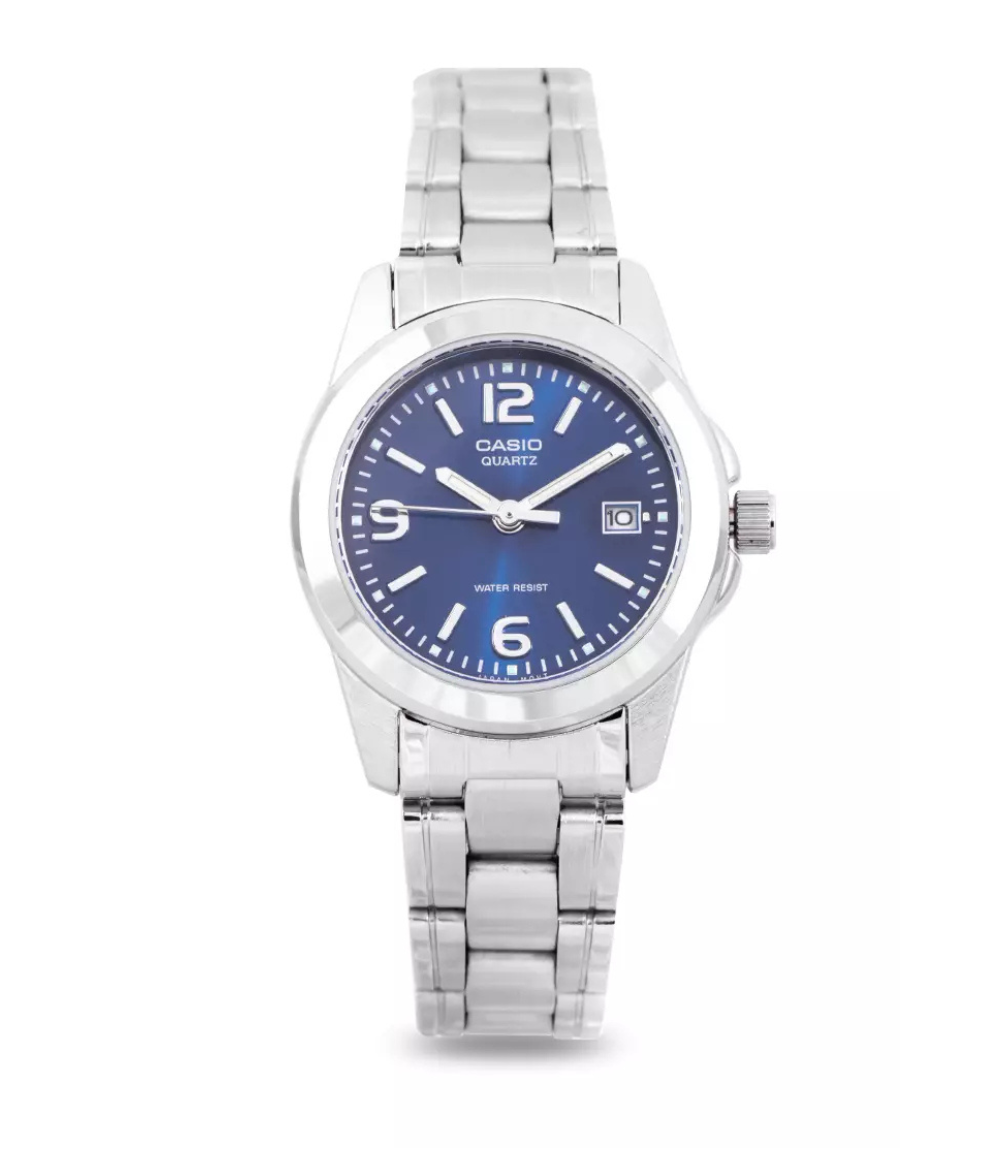 The Casio LTP-1215A-2A is an elegant ladies’ analog watch featuring a stylish blue dial with a stainless-steel case and bracelet. Powered by reliable quartz movement, it offers precise timekeeping with a convenient date display. Its slim design, mineral glass protection, and water-resistant construction make it ideal for both everyday wear and formal occasions.