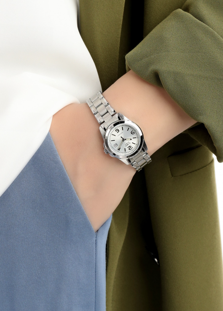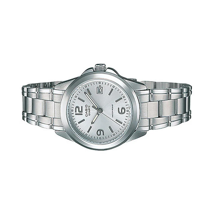 The Casio LTP-1215A-7A is a classic ladies’ analog watch featuring a clean silver dial and a durable stainless-steel case and bracelet. Powered by reliable quartz movement, it offers precise timekeeping with a convenient date display. With mineral glass protection and a slim elegant design, this watch is ideal for both everyday wear and formal occasions.