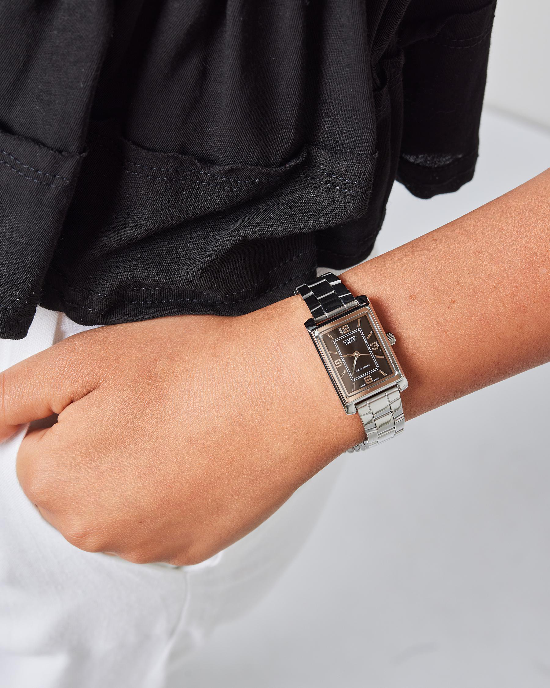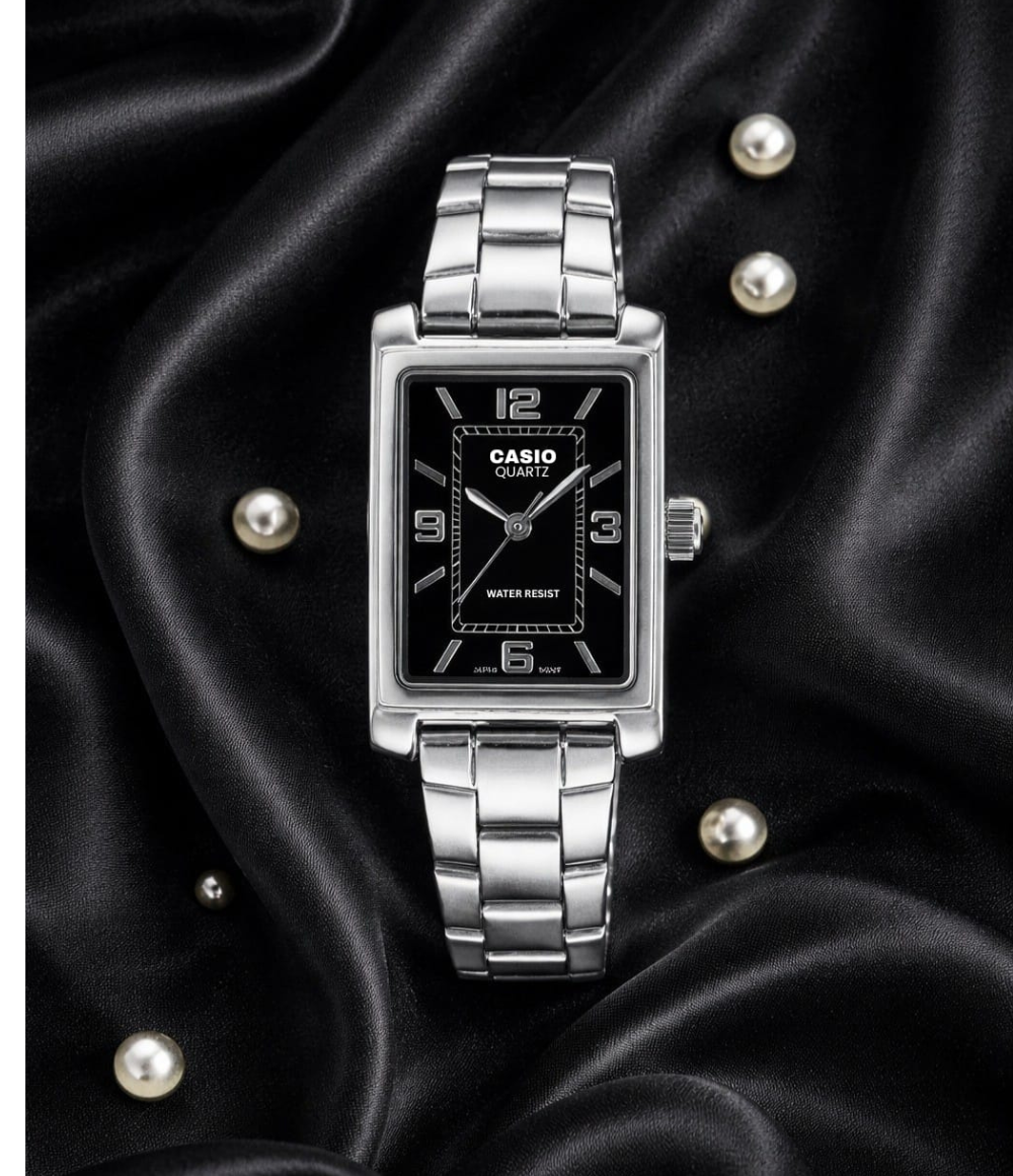 The Casio LTP1234DD-1A is a sleek and modern ladies’ watch designed with a bold black dial and a durable stainless steel bracelet. Its elegant rectangular case adds a unique touch, making it perfect for both professional and casual wear. Powered by reliable quartz movement, this timepiece ensures precision, comfort, and timeless style.