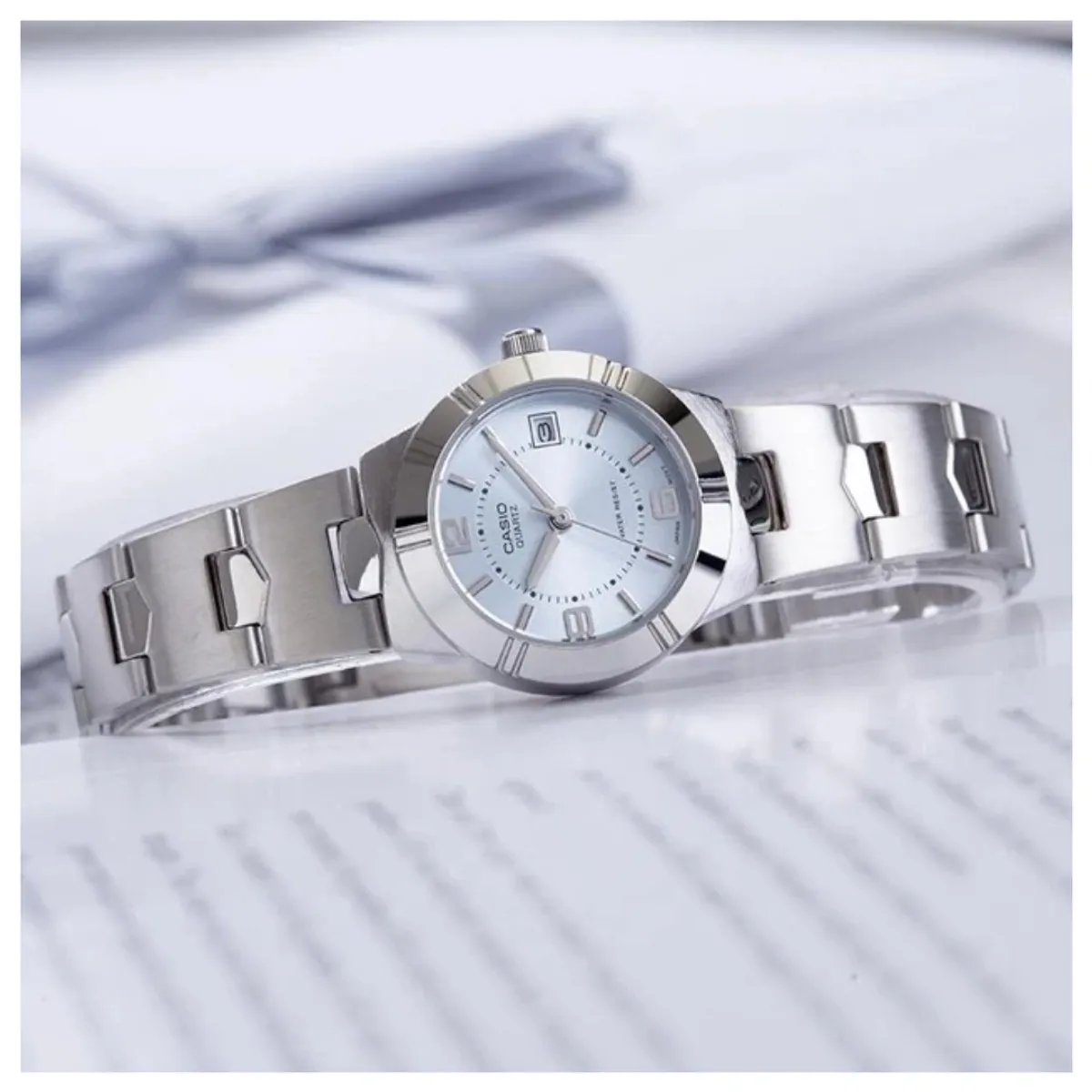 A stylish and elegant ladies watch featuring a rich blue dial paired with a sleek stainless steel bracelet. Its classic design with a date display adds both beauty and functionality—perfect for office wear, formal occasions, and everyday use.