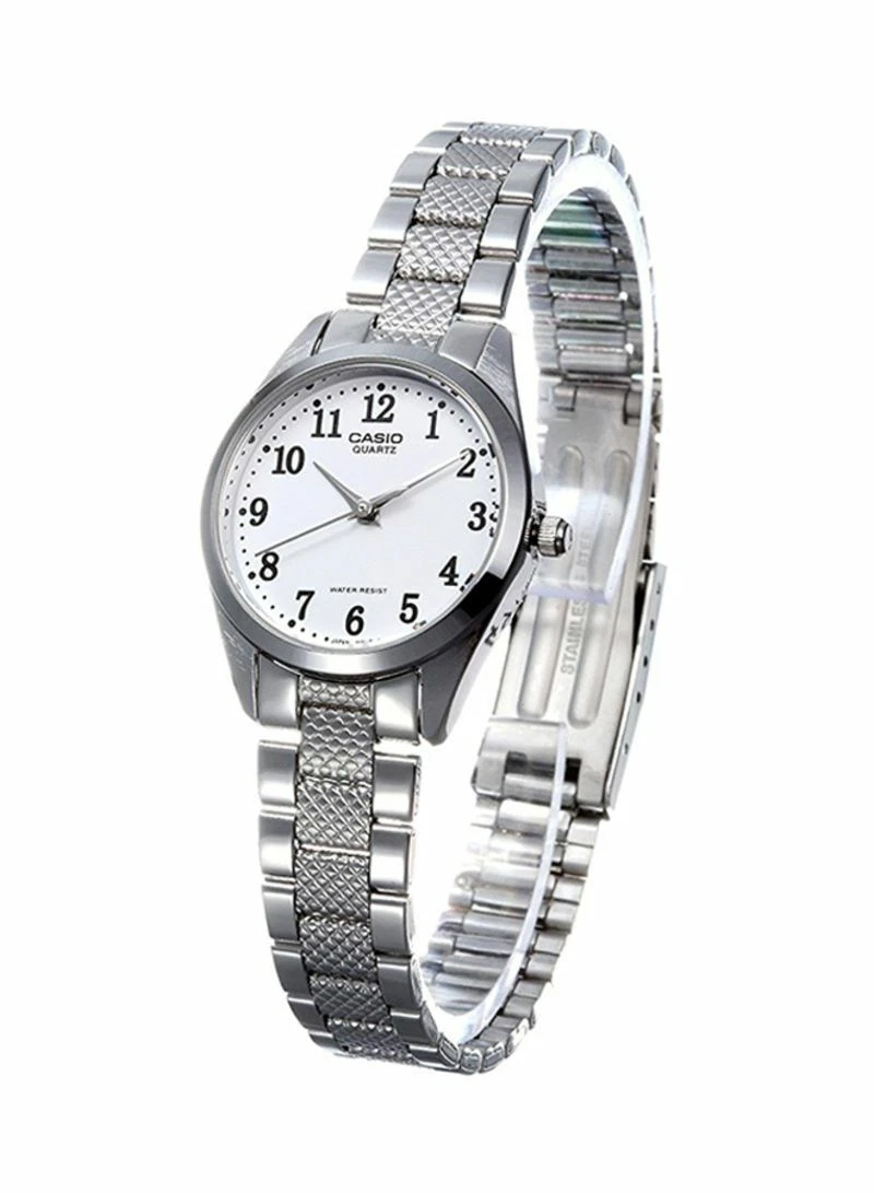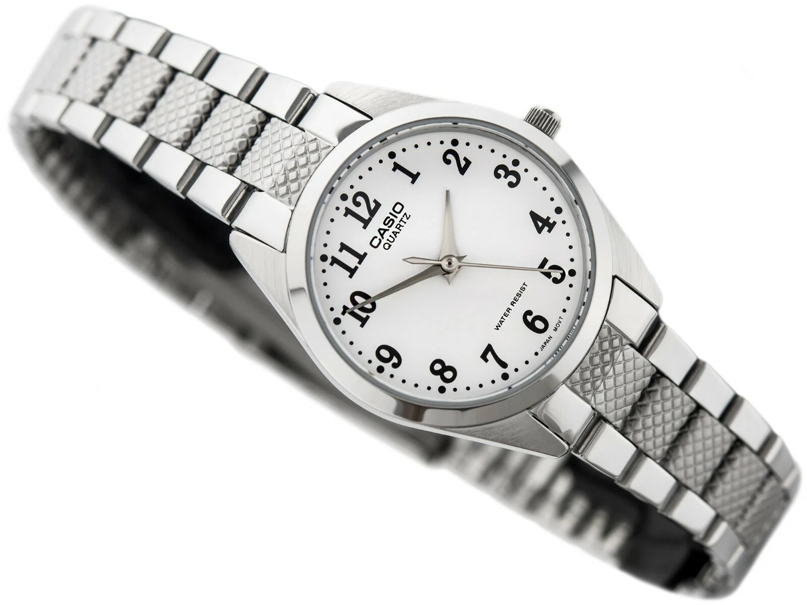 The Casio LTP-1274D-7B is a refined ladies’ watch featuring a crisp white dial with bold markers and a polished stainless steel bracelet. Its slim rectangular design and elegant finish make it ideal for everyday wear as well as formal occasions.