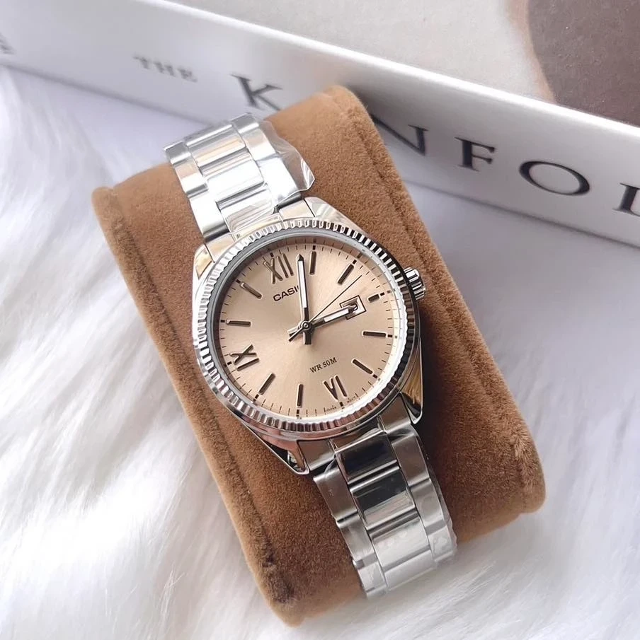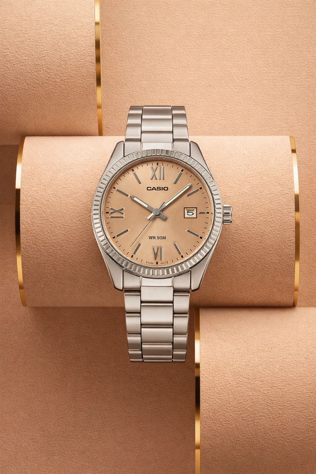 The CASIO LTP1302DD-4A2 is a stylish women’s analog watch that blends timeless design with everyday practicality. Featuring a refined gold-tone sunray dial with easy-to-read markers and a date display at the 3 o’clock position, this timepiece adds a touch of elegance to any outfit. Its durable stainless steel bracelet with a secure triple-fold clasp ensures lasting comfort, while reliable quartz movement delivers accurate timekeeping. With water resistance up to 50 meters, the LTP1302DD-4A2 is perfect for daily wear, rain or shine.