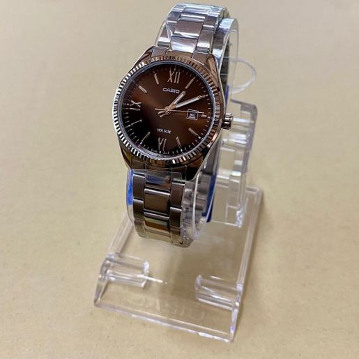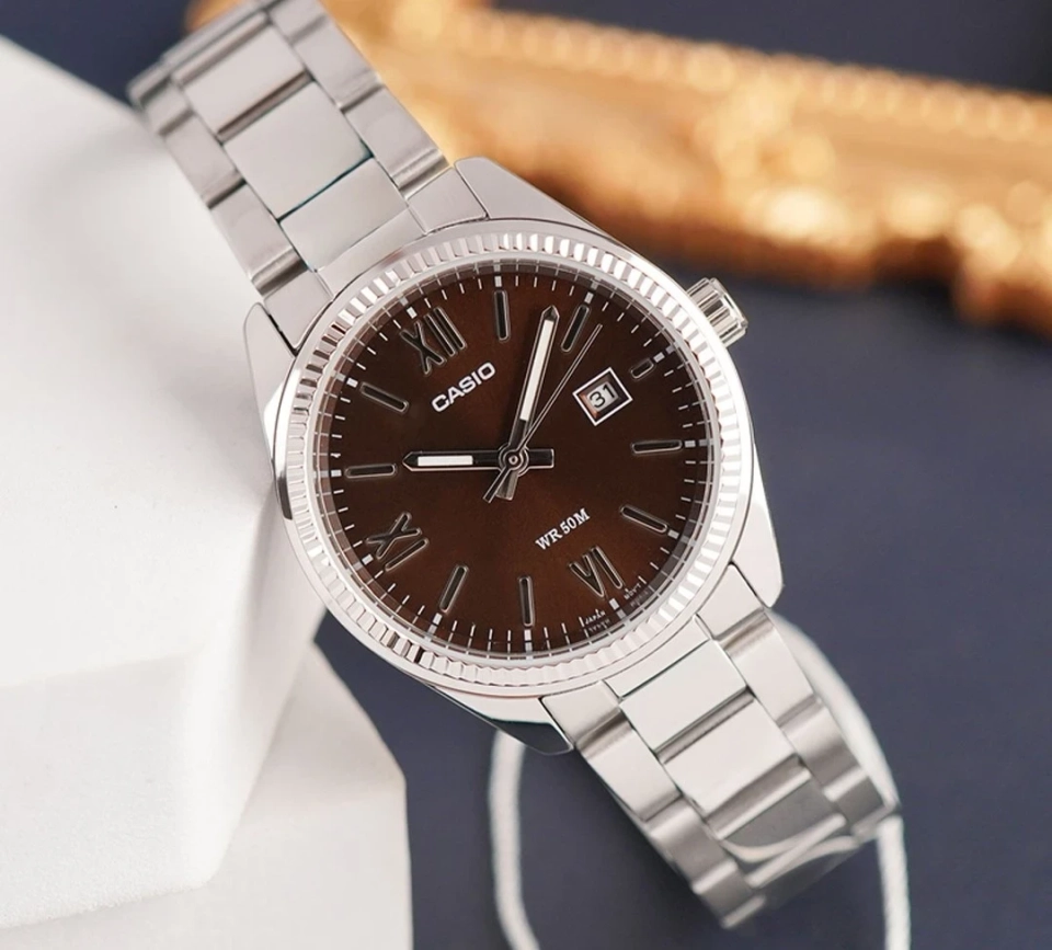 The CASIO LTP1302DD-5A is a classic women’s analog watch that delivers everyday elegance with reliable performance. Its sophisticated sunray brown dial and polished silver-tone stainless steel bracelet make it a versatile accessory for both casual and formal wear. Featuring a clear date display at the 3 o’clock position and accurate quartz movement, this timepiece offers functionality you can count on. With durable mineral glass and 50 meters of water resistance, the LTP1302DD-5A stands up to daily use while maintaining its timeless style.