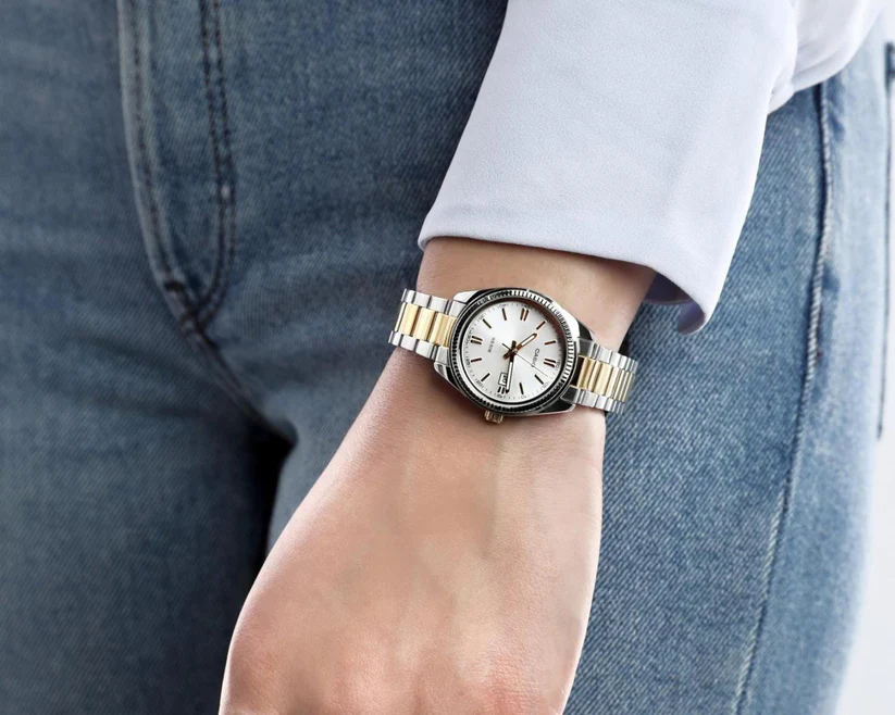 Classic and elegant, the Casio LTP-1302SG-7A features a refined silver-white dial with stylish gold accents and a two-tone stainless steel bracelet. Designed for timeless sophistication, it offers durability, water resistance, and a premium look—perfect for everyday wear and formal occasions.