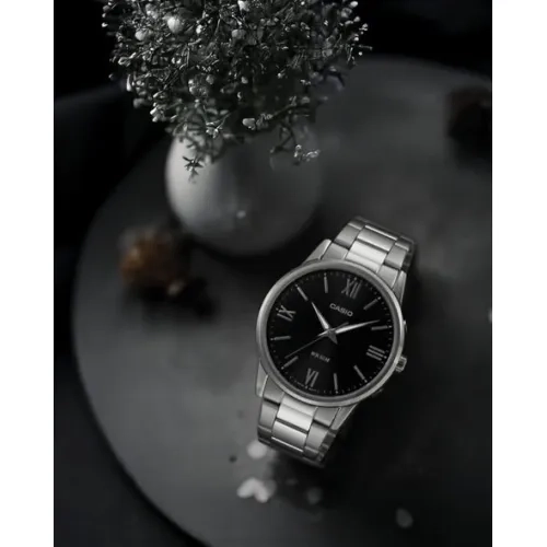 A sleek and timeless watch featuring a bold black dial with a polished stainless steel finish. Designed for everyday elegance, it offers a perfect balance of simplicity, durability, and reliable Casio performance.