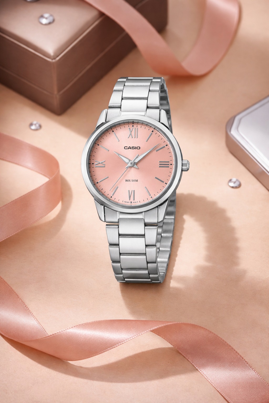 A soft and elegant timepiece featuring a beautiful peach dial paired with a sleek stainless steel finish. Designed for a feminine and modern look, it’s perfect for both casual and formal wear.