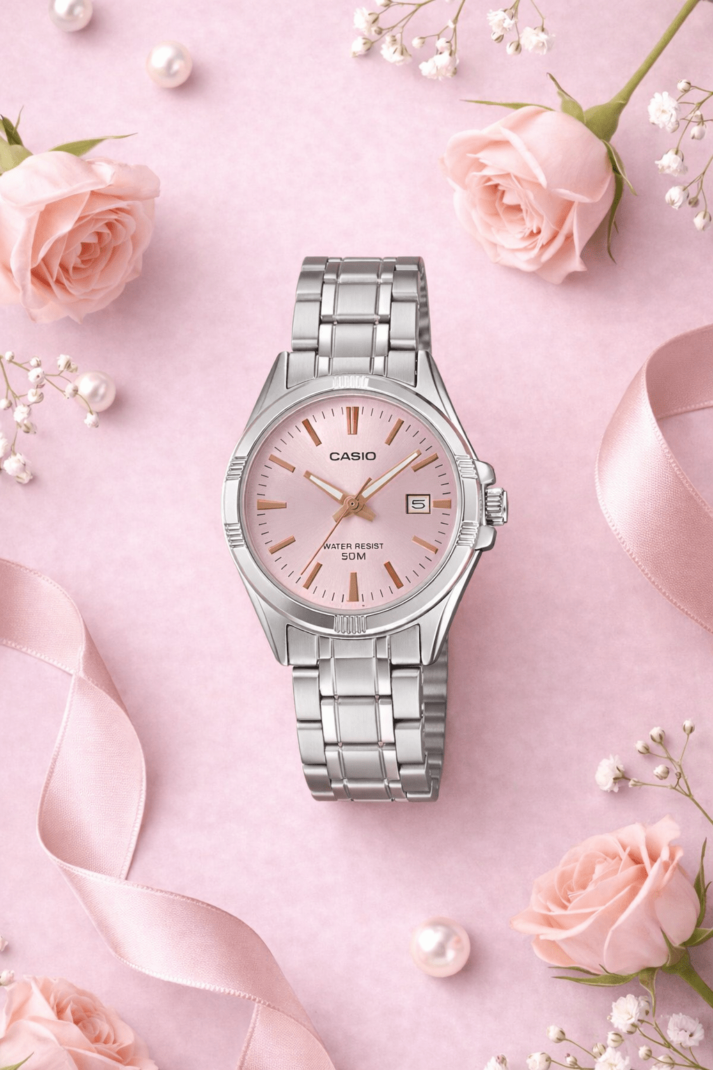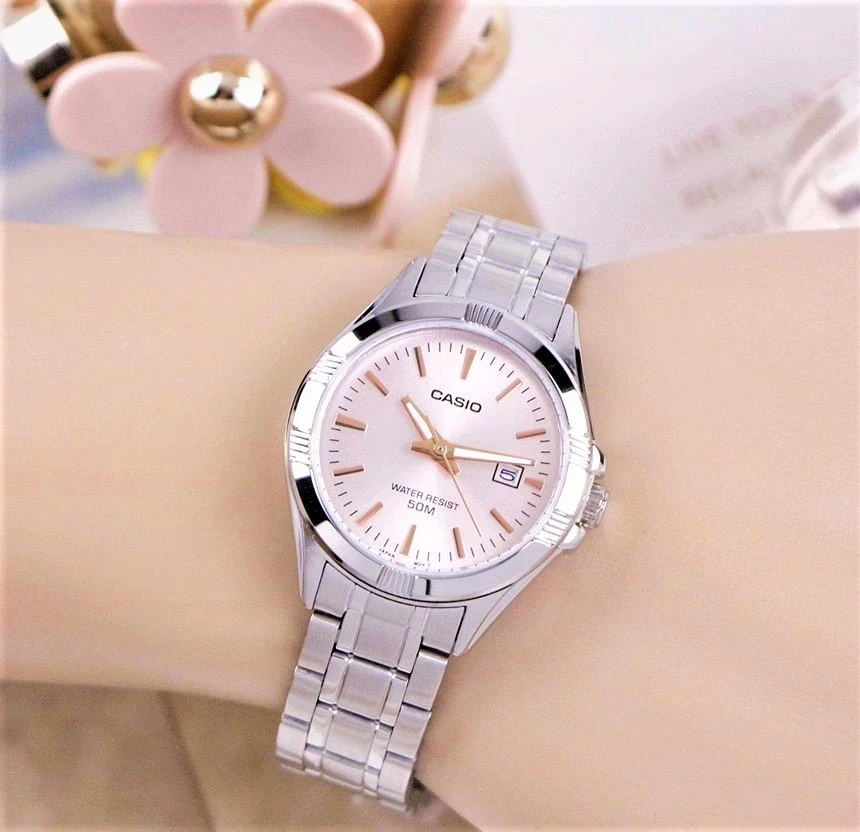 The Casio LTP-1308D-4A is a stylish ladies watch designed for women who appreciate elegant simplicity. Featuring a soft pink dial with a polished silver stainless-steel bracelet, this watch offers a perfect blend of femininity and everyday practicality. The clean analog display ensures easy readability, while the date display at 3 o’clock adds useful daily functionality.