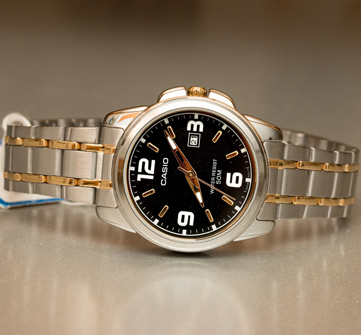 A classy and elegant timepiece featuring a bold black dial with a stylish two-tone (silver & gold) stainless steel strap. Perfect for everyday wear with a premium and timeless look.