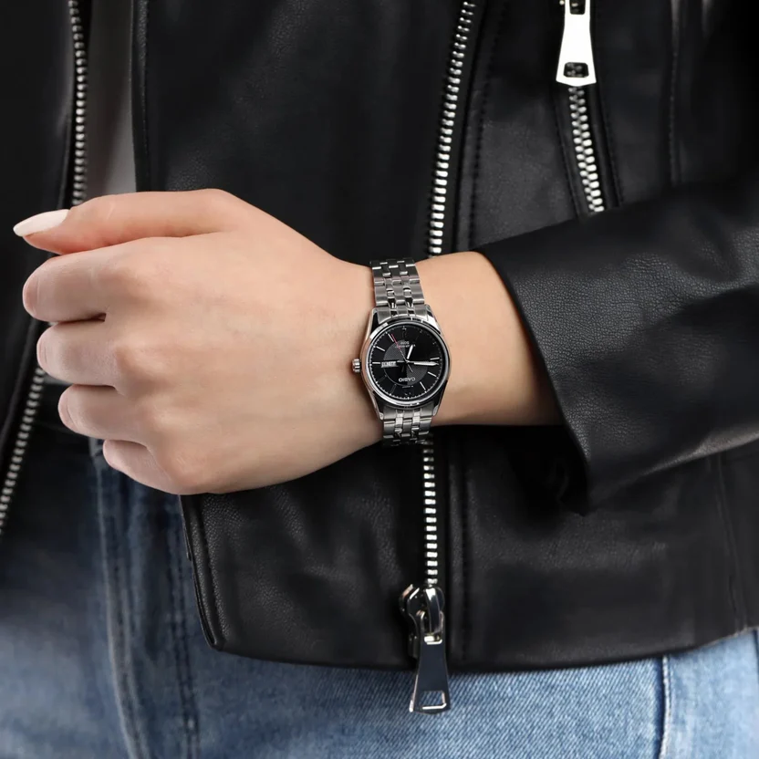 A timeless and versatile watch featuring a sleek black dial paired with a polished stainless steel strap. Its clean and minimal design makes it perfect for everyday wear with a classic, elegant touch.