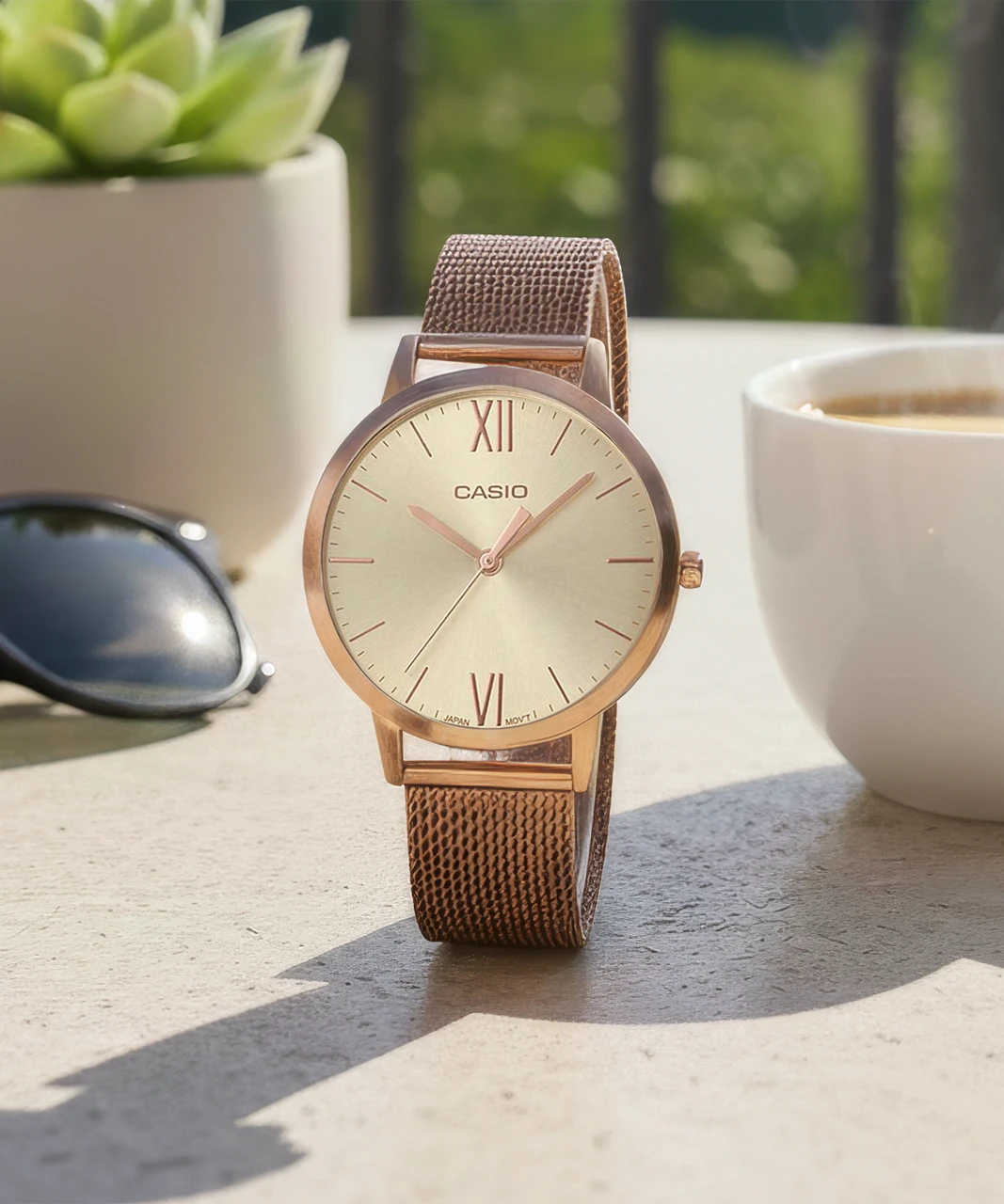 A stylish and elegant watch featuring a rose gold tone dial with a slim case, paired with a rose gold stainless steel mesh strap. Designed for a modern, minimal look—perfect for daily wear and formal occasions.