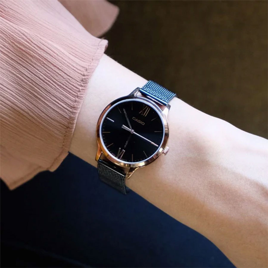 A modern and elegant watch featuring a black dial with a rose gold case, paired with a black stainless steel mesh strap. Its slim design gives a premium, stylish look—perfect for both daily wear and formal occasions.