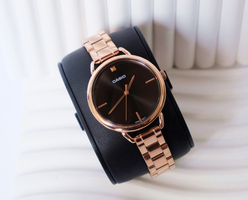 The Casio LTP-E415PG-1C is a stylish women’s watch featuring a sleek black dial paired with an elegant rose gold-tone case and bracelet. Designed for a minimalist and modern look, this timepiece is perfect for everyday wear as well as special occasions.