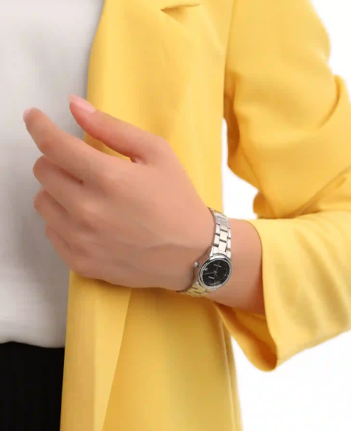 A sleek and elegant ladies watch featuring a black sunray dial with a stainless steel silver bracelet. It includes a date display and minimalist hour markers, making it perfect for everyday wear with a touch of sophistication.