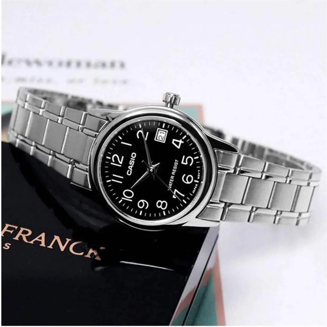 A stylish and minimal ladies watch from Casio featuring a clean black dial with slim hour markers and a stainless steel bracelet. Designed for daily elegance, it combines durability, comfort, and a timeless look suitable for both office and casual wear.