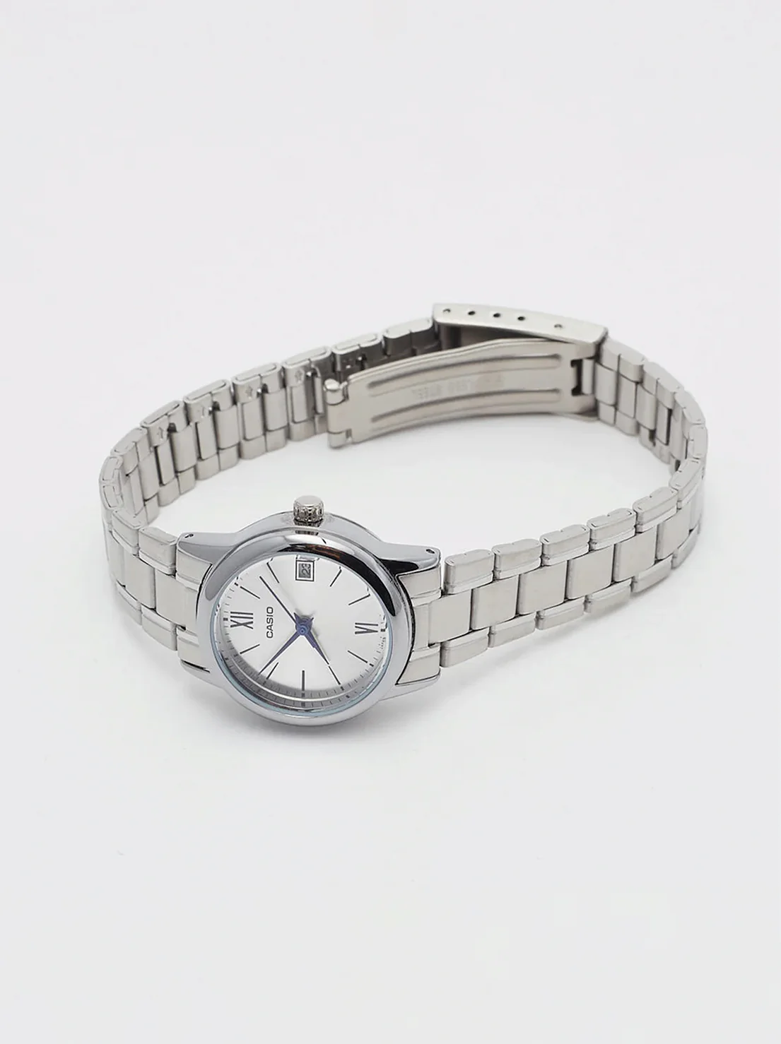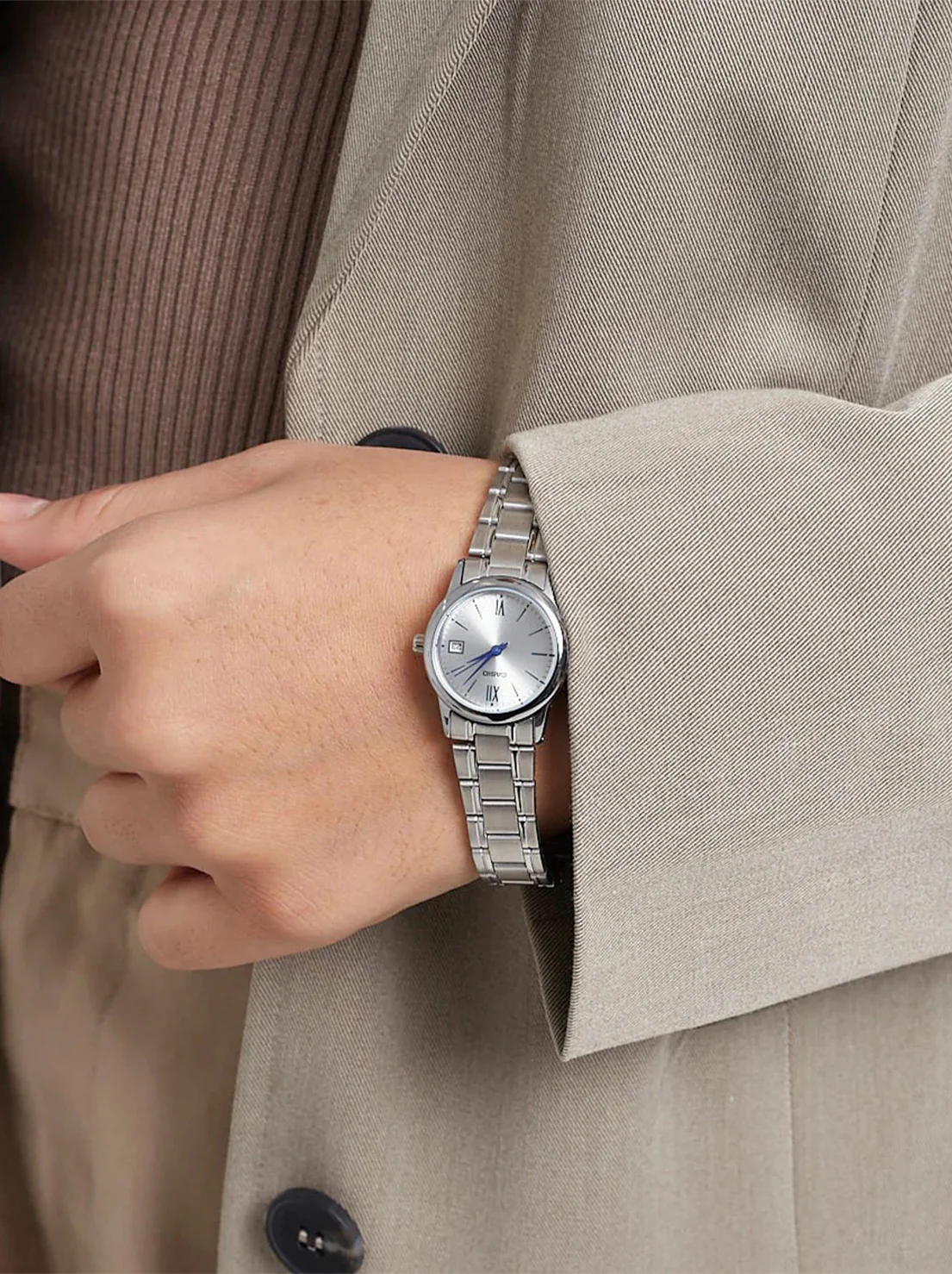 A refined and elegant women’s analog watch featuring a silver dial with a mix of Roman numerals and bar indexes for a classic look. Designed for everyday versatility, it offers reliable quartz movement, a stainless steel strap, and a practical date display.