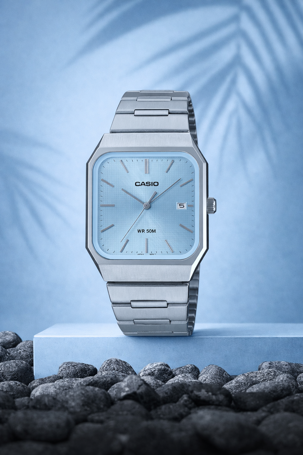 A trendy vintage-style watch featuring a refreshing sky blue dial with a sleek stainless steel bracelet. Its slim case and integrated design give a modern retro look, making it perfect for everyday wear, office style, or casual outings.