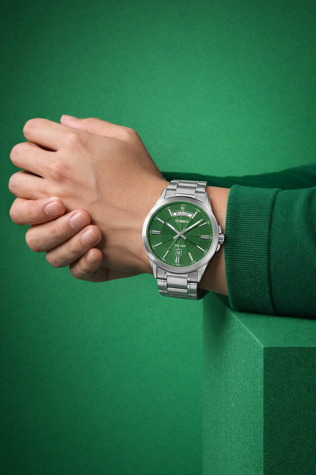 A bold and stylish analog watch featuring a rich green dial with a wide day-date display and full stainless steel finish. The MTP-1381D-3A offers a premium look with reliable quartz performance—perfect for both formal and everyday wear.