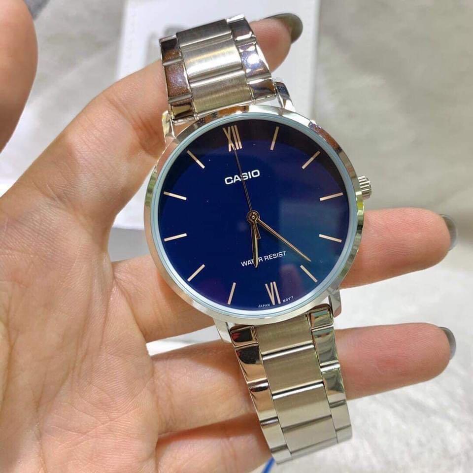 The CASIO MTPVT01D‑2B is a stylish men’s analog wristwatch from Casio featuring a striking blue dial set in a classic silver‑tone stainless steel case and bracelet. Designed for everyday wear, this watch combines a minimalist aesthetic with reliable quartz timekeeping. The bold blue dial is easy to read with simple markers and three‑hand analog display, making it perfect for casual or formal occasions alike. Its water resistance provides protection against splashes during daily use.