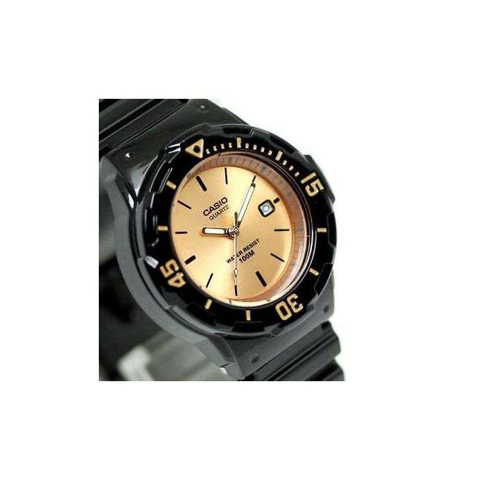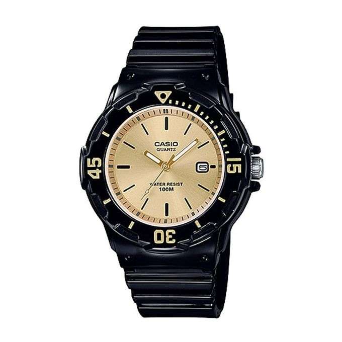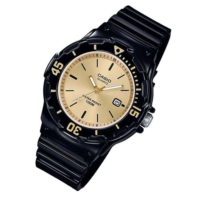 The Casio Youth LRW200H-9E is a stylish and sporty ladies watch designed with a bold gold-tone dial and black resin strap, giving it a modern and eye-catching look. Inspired by classic diver-style watches, it features a rotating timer bezel and a clear analog display for easy time reading.