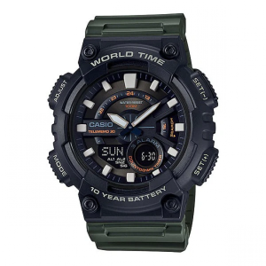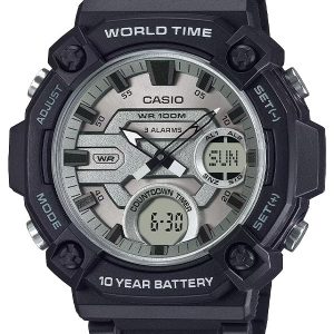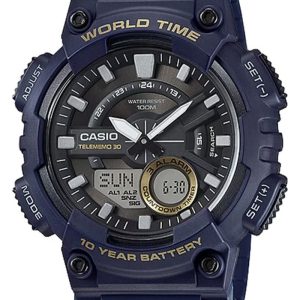 The Casio AEQ-120W-7A is a rugged analog-digital watch that blends sporty design with practical everyday features. Built with a durable resin case and band, it offers reliable timekeeping, world time, stopwatch, countdown timer, and multiple alarms. With 100 m water resistance and an impressive 10-year battery life, it’s perfect for active lifestyles and daily wear.