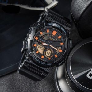 CASIO AEQ‑110W‑1A2 is a stylish analog‑digital men’s sports watch with a bold black and orange design, built for everyday use. It features world time, Telememo 30 phone memory, stopwatch, countdown timer, multiple alarms, and a long‑lasting battery — all packed into a rugged resin case with 100 m water resistance.