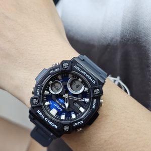 CASIO AEQ-110W-1A is a rugged analog-digital sports watch designed for everyday reliability. Featuring a bold black design, dual time display, stopwatch, alarm, LED backlight, and 100-meter water resistance, it’s ideal for active lifestyles and daily wear.