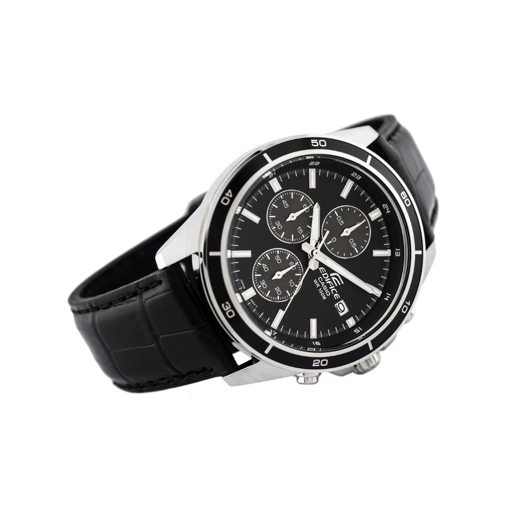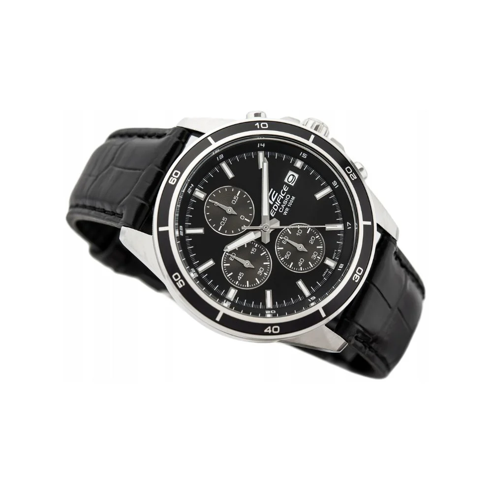 The Casio Edifice EFR-526L-1A Chronograph Watch is a sporty and stylish gents watch designed for modern men who appreciate precision and performance. Featuring a bold black dial with chronograph sub-dials and a genuine leather strap, this Edifice timepiece blends racing-inspired design with everyday functionality. With durable stainless steel construction and 100-meter water resistance, it is perfect for both casual wear and active lifestyles.