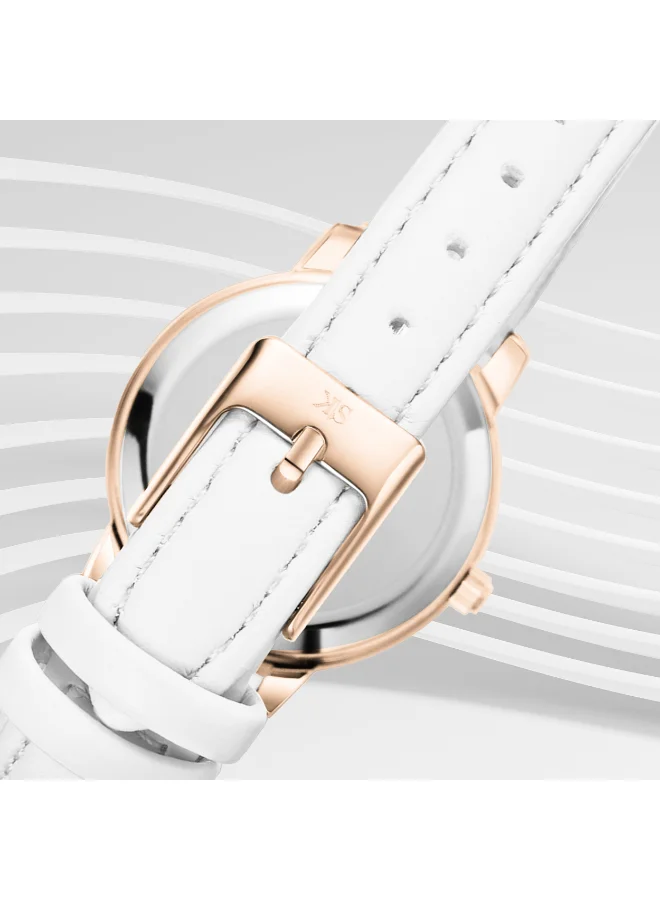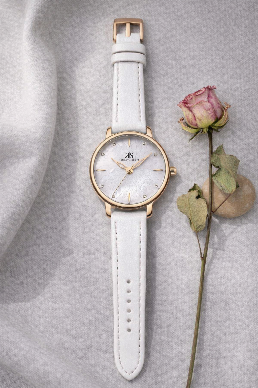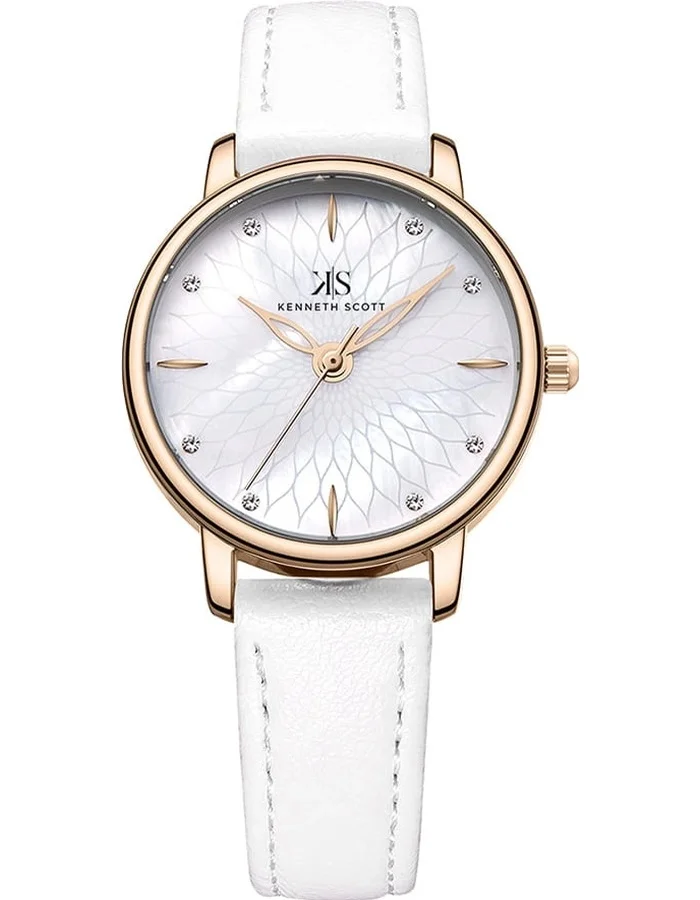 The KENNETH SCOTT 22524KLWM is a chic women’s analog wristwatch featuring a clean white dial paired with a matching white polyurethane strap for a fresh and stylish look. Housed in a round alloy case with a rose-gold tone finish, this timepiece offers reliable quartz movement and a simple analog display. The comfortable polyurethane strap and classic design make it ideal for everyday wear, casual outings, or as an accessory to brighten any outfit.