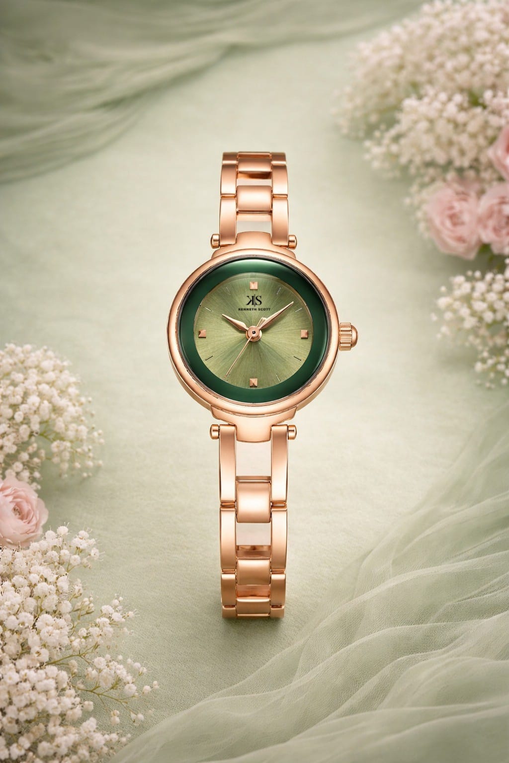 The Kenneth Scott 23516 Green Dial Watch is a stylish and elegant timepiece designed for modern fashion lovers. Featuring a beautiful olive-green dial paired with a rose-gold stainless steel bracelet, this watch delivers a premium and sophisticated look suitable for both casual and formal wear.