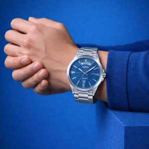 A stylish and modern analog watch featuring a deep blue dial with day-date display and full stainless steel finish. The MTP-1381D-2A offers a perfect balance of elegance and everyday durability—ideal for office wear and casual occasions.