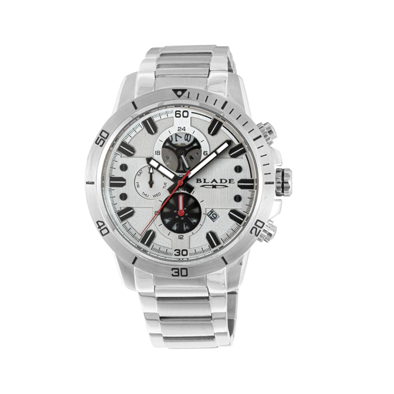 BLADE Virtuoso White 3627G2SWS – Intrepid Collection – Round – 46mm Stainless Steel Case – Hardened Mineral Glass – Silver Dial – Dual-Time Multifunction Quartz Movement – 22mm Stainless Steel Band – Fold over with Pushers and Safety Clasp Buckle – 10ATM Water Resistant – Men’s Watch – 2 Years Warranty