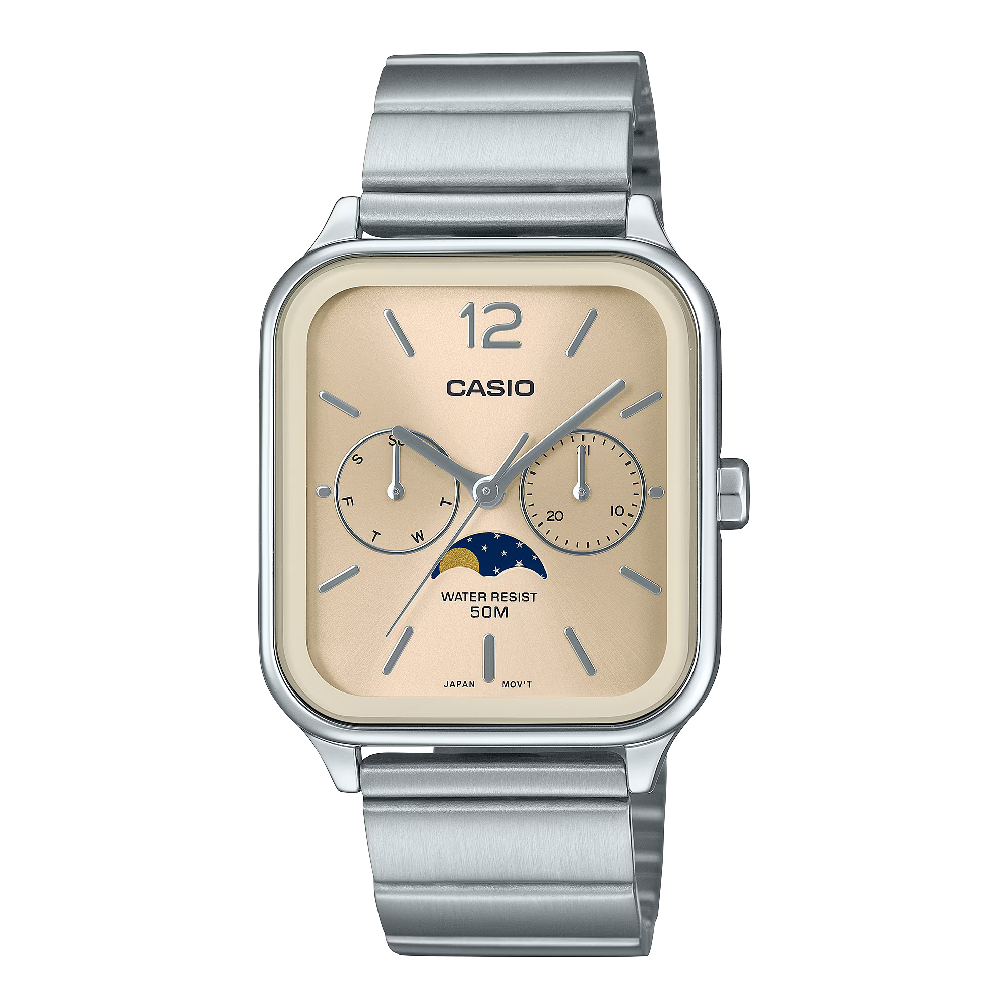 Regular timekeeping: Analog: 3 hands (hour, minute, second), 3 dials (date, day, moon phase)