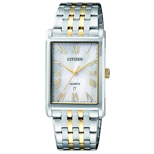 The CITIZEN BH3004-59D radiates classic sophistication with a mother-of-pearl dial, 40mm gold-tone stainless steel case, and bracelet. This elegant timepiece features a date display and is water-resistant up to 30 meters, making it perfect for special occasions.