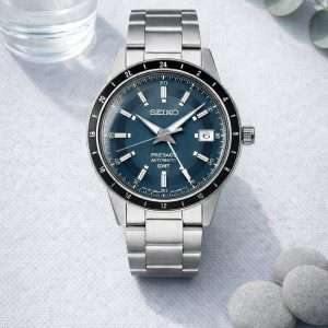 A refined and elegant automatic GMT watch featuring a petrol blue dial with vintage “Style 60s” design. The SSK009J1 combines classic Presage aesthetics with modern dual-time functionality, making it perfect for both formal and everyday wear.