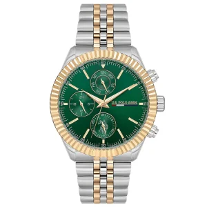 The U.S. Polo Assn. A1054B-08 features a bold and stylish design with a striking green dial complemented by gold and metallic grey accents. Its classic round case and premium stainless steel bracelet offer a perfect balance of elegance and durability. Designed for modern men, this watch is ideal for both formal and everyday wear, delivering a confident and sophisticated look.