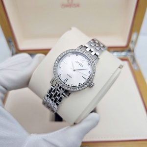 The CITIZEN EL3100-55A is a stylish women’s analog wristwatch that combines everyday functionality with elegant design. It features a classic round dial with a silver finish and sparkling crystal accents, adding a touch of sophistication to your look while remaining versatile for casual or dress wear. The timepiece is powered by a precise quartz movement, ensuring reliable timekeeping without frequent adjustments. Housed in a 31 mm stainless steel case with a matching bracelet, this watch is durable and comfortable for all-day wear. Its water resistance of up to 50 meters (5 ATM) means it can handle splashes, rain, or washing hands without worry. Finished with a fold-over clasp with safety release for secure fit, the EL3100-55A makes an excellent and timeless accessory for the modern woman.