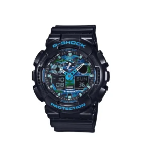 The G-Shock GA100CB-1A combines rugged durability with bold style, making it a standout choice for everyday wear and outdoor adventures. Built with Casio’s legendary shock resistance and magnetic resistance, this watch is engineered to withstand tough conditions without missing a beat. It features a large, half-matte black resin case accented with striking blue highlights and a unique blue camouflage-patterned dial that adds a modern, fashion-forward aesthetic. The combination analog-digital display offers versatile timekeeping with precision and practical functions like world time across 29 time zones, an auto-LED backlight, stopwatch, countdown timer, multiple alarms, and a full auto-calendar. With 200 m water resistance, reliable quartz movement, and up to 2 years of battery life, this G-Shock is ready for both daily wear and extreme environments.