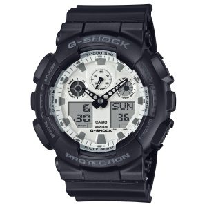 The CASIO G‑SHOCK GA100WD‑1A is a bold, high‑contrast analog‑digital timepiece with a matte black case and band paired with a brilliant white dial, designed for toughness, reliability, and everyday wear.