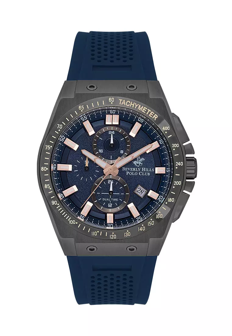 Elevate your style with the Beverly Hills Polo Club 3541X-099 Men’s Dual Time Watch. This sophisticated timepiece features a sleek, modern design with a stainless steel case and a comfortable blue silicone strap. The chronograph function allows you to track elapsed time with precision, while the dual time feature makes it perfect for international travelers. With its classic polo club logo and a tachymeter bezel, this watch is a statement piece that exudes luxury and sophistication.
